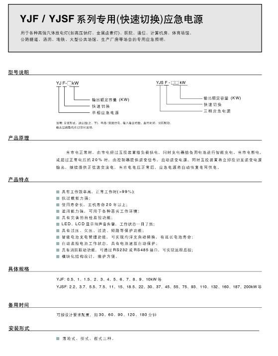 具有快速切换功能的专用电源YJF / YJSF,工作为后备供电方式。当市电正常时,市电经过静态开关直接为负载供电、机内的逆变器处于空载备用状态。当市电故障时,静态开关会快速将负载切换到逆变器上,由蓄电池经逆变后继续为负载供电。当市电恢复正常时,静态开关自动将负载切回到市电上。在切换过程中。采用了先进的DSP控制技术与高速可控硅组成的快速切换装置。DSP控制技术可在正常市电的一个周期内完成数百次采样检测并作出相应的数学分析,可快速侦测出市电出现的断电、瞬时跌落、波形失真以及电压过低等市电异常,并控制高速可控硅进行切换动作。